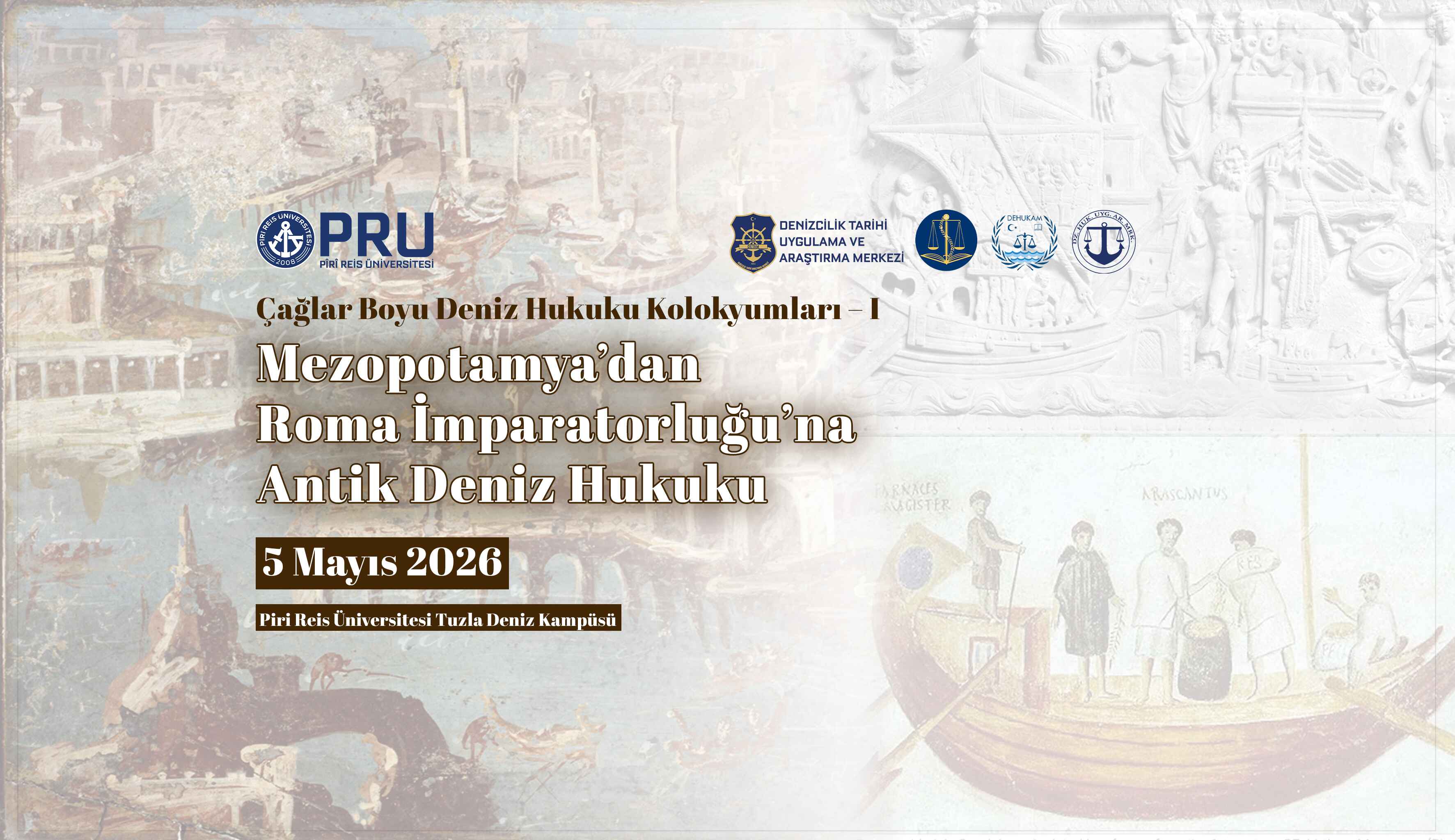 Pîrî Reis Üniversitesi Hukuk Fakültesi, Deniz Hukuku ve Uygulama Araştırma Merkezi (DHUAM), Denizcilik Tarihi Uygulama ve Araştırma Merkezi (DETAM) ve Ankara Üniversitesi Deniz Hukuku Ulusal Araştırma Merkezi (DEHUKAM) iş birliğiyle, “Çağlar Boyu Deniz Hukuku Kolokyumları” başlıklı kapsamlı bir bilimsel etkinlik dizisi başlatılmaktadır. Bu seri, dünya deniz hukukunun tarihsel gelişimini Mezopotamya’dan modern deniz hukukuna kadar geniş bir yelpazede incelemeyi amaçlamakta olup; birinci oturumu, “Mezopotamya’dan Roma İmparatorluğu’na Antik Deniz Hukuku” temasıyla gerçekleştirilecektir.