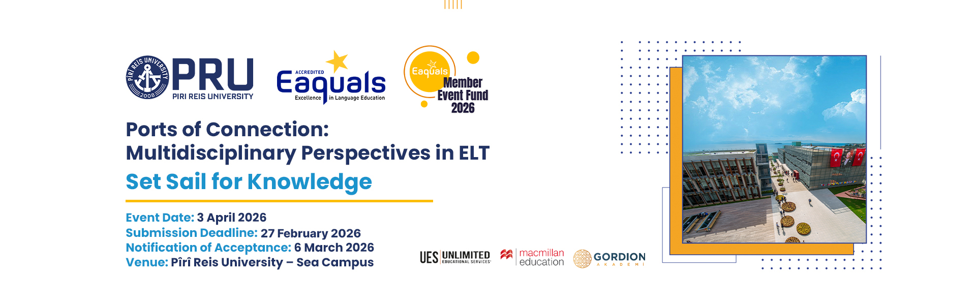 The International Conference “Ports of Connection: Multidisciplinary Perspectives in ELT (English Language Teaching),” organized by the English Preparatory School of Pîrî Reis University, will take place on 3 April 2026 in Istanbul, Türkiye. The conference aims to bring together scholars and practitioners in English Language Teaching to foster interdisciplinary collaboration and promote innovative pedagogical approaches grounded in research and technology-enhanced practices. Drawing on perspectives from disciplines such as technology, psychology, letters, media, communication, and education policy, the event seeks to highlight evidence-based studies and exemplary practices, strengthen institutional and international academic networks, and contribute to sustainable and effective improvements in teaching and learning processes.