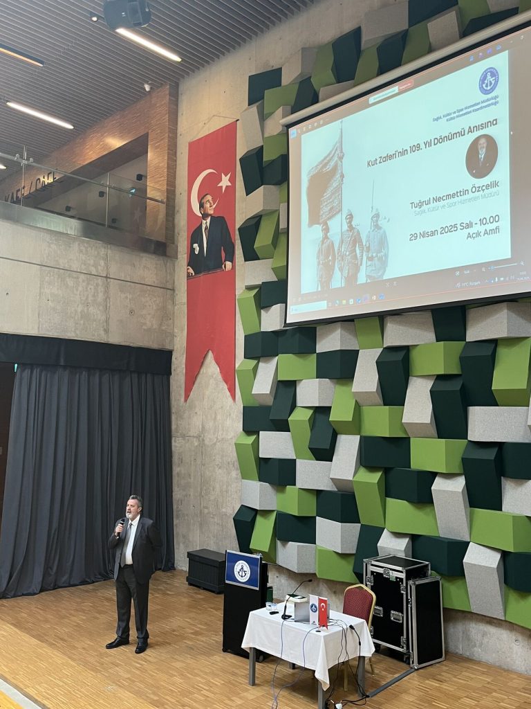 “ Kut Zaferi’nin 109. Yıl Dönümü Anısına” konulu etkinlik, Sağlık, Kültür ve Spor Hizmetleri Müdürü Sn. Tuğrul Necmettin Özçelik’in sunumuyla 29 Nisan 2025 Salı günü saat 10.00 ile 11.00 arasında Açık Amfi’de gerçekleşti. Tarihe ışık tutan bu özel etkinlikte, Kut Zaferi’nin tarihi önemi, Osmanlı ordusunun üstün mücadelesi ve zaferin günümüze yansımaları ele alındı.