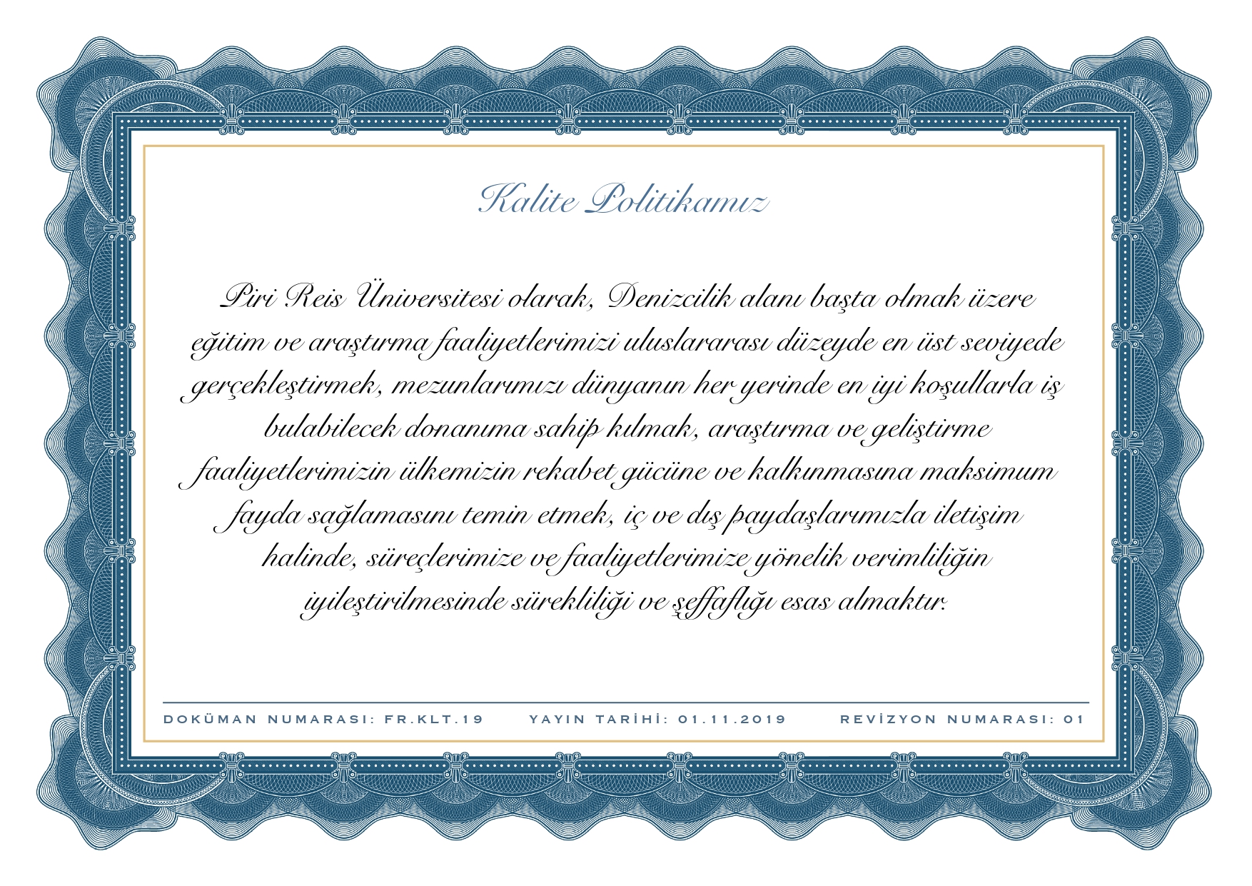 Pîrî Reis Üniversitesi eğitim-öğretim, araştırma-geliştirme, toplumsal katkı, uluslararasılaşma, yönetim ve idari hizmetler yoluyla ulusal ve uluslararası alanda değer yaratma sürecinde kalite odaklı yönetim sisteminin varlığını ve sürdürülebilirliğini hedeflemektedir. Üniversitemizin “yönetim sistemi politikası”, aşağıda belirtilen ana unsurları kapsamaktadır: